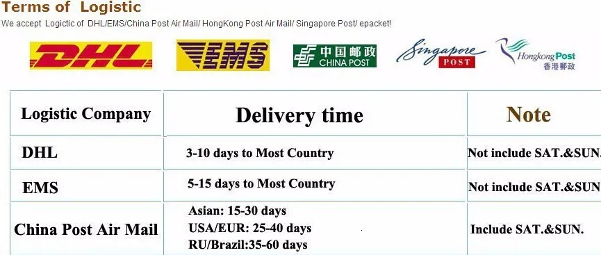 ----We can offer express delivery like EMS/DHL. In normal condition, it will take about 3-7 working days via express delivery. If you want express delivery, please contact us, we will caculate the postage for you, or you can check Shipping&Packaging for reference.We will choose a suitable delivery acoording to your country, as to strive for a fastest and reliable shipping for your order.